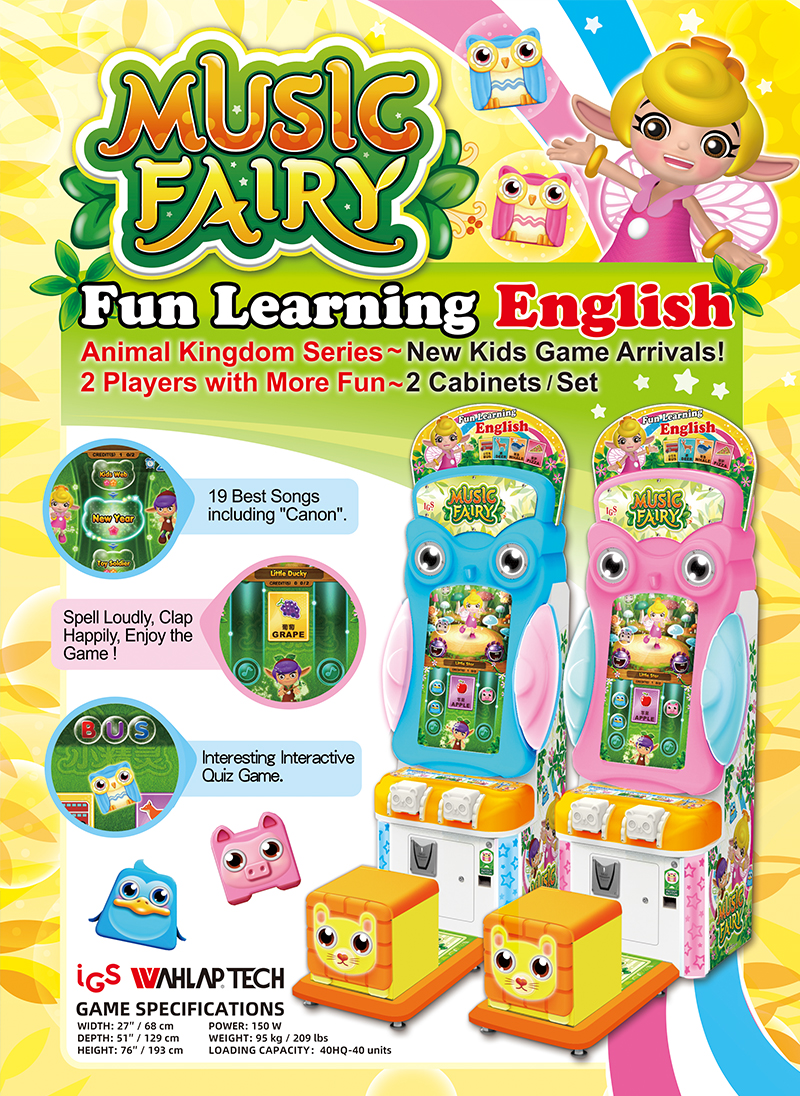 This unit combines a Music button pushing game with a Fun spelling game. Players hit buttons to the beat and engage in an educational English quiz to earn higher scores. This unique blend of rhythm and learning makes it a standout video arcade title among children's arcade games, offering true "edutainment" value.