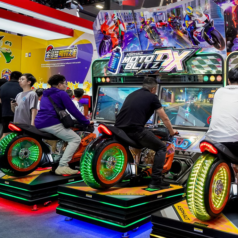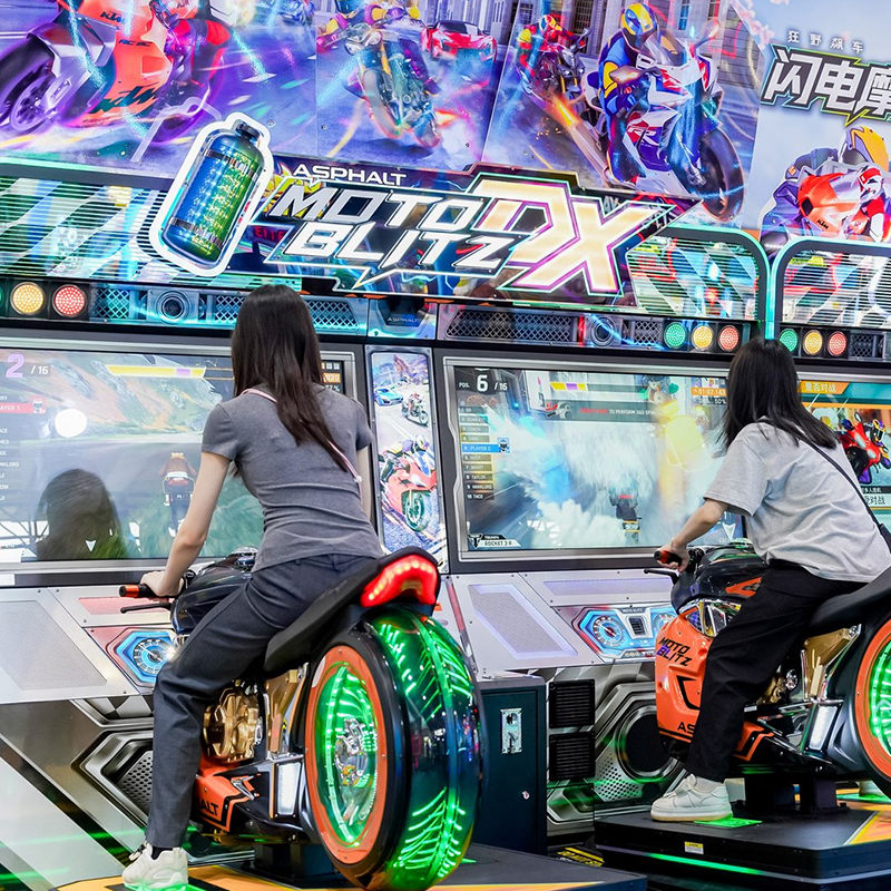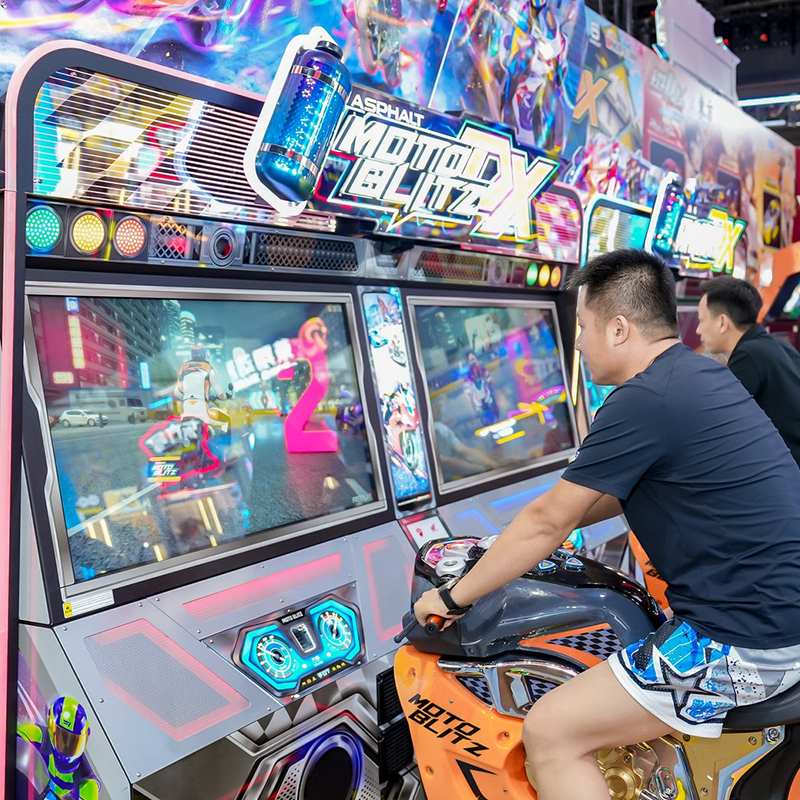 Engineered as the Asphalt Moto Blitz DX, this cabinet allows players to corner by strictly tilting the bike body on a motion platform. This physics-based control defines top-tier driving arcade game machines, transforming any video arcade into a high-octane 5D simulation comparable to the best arcade driving games.