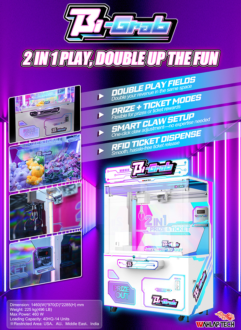 The Bi-Grab is a high-earning claw arcade machine where double play fields double your revenue. Its bright cabinet draws large attention in any venue, outperforming standard claw machine arcade games by maximizing footprint efficiency as a versatile arcade machine.