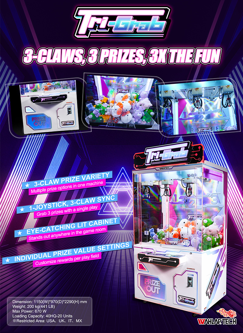 This unique three-claw prize crane offers a variety of prize options, revolutionizing the claw machine arcade game market. Players can drop all three claws simultaneously using a single joystick and win up to three different prizes with one play, creating a thrill unmatched by any standard arcade crane machine or grab machine arcade unit.