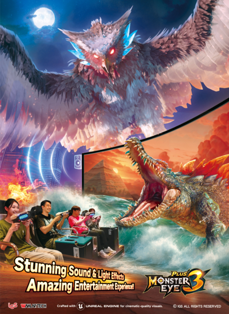 Delivering Theater-Grade Immersion, "Monster Eyes 3 Plus" features a massive screen and Dynamic Seats synchronized with the storyline. The 4D Immersion is enhanced by built-in vibrating speakers and a 4.1-Channel Audio system with seatback surround sound. This setup creates the best arcade environment, redefining the video game arcade experience with a VIP Tier Experience.