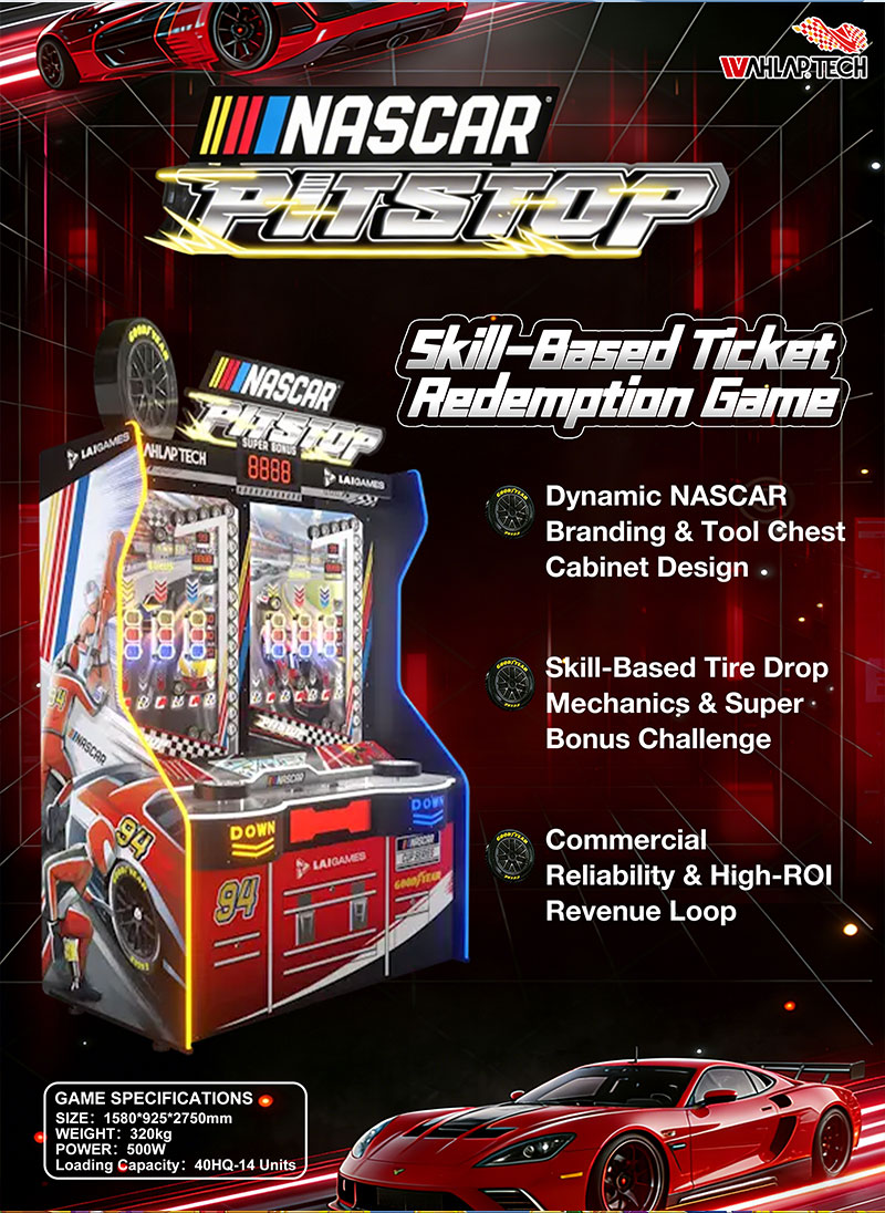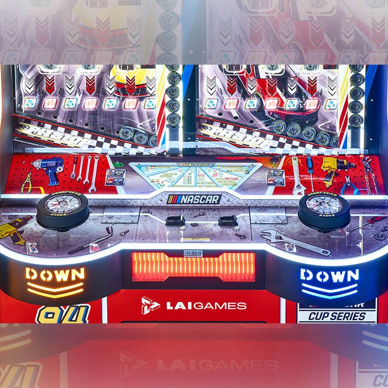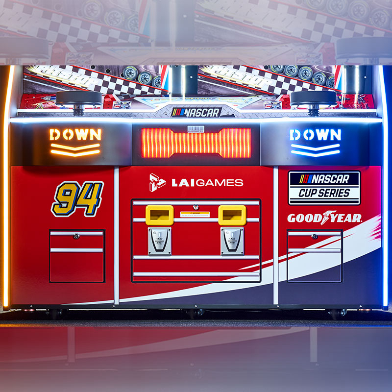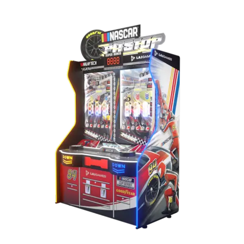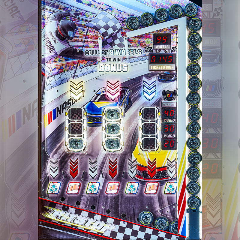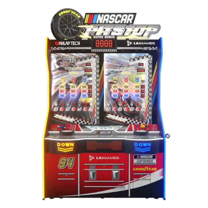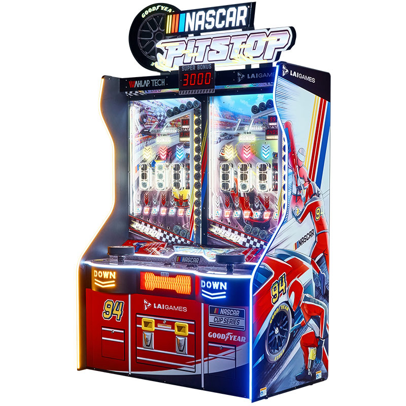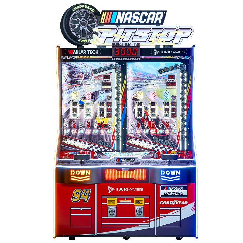 Dynamic NASCAR Branding & Tool Chest Cabinet Design This high-impact Ticket Game Machine features iconic NASCAR and Goodyear branding that commands attention in any games arcade. The NASCAR PIT STOP is housed in a unique cabinet styled like a garage tool chest, creating a professional racing atmosphere for video arcade games enthusiasts. Its vibrant colors and striking lighting effects are designed to immerse players in a high-speed environment.