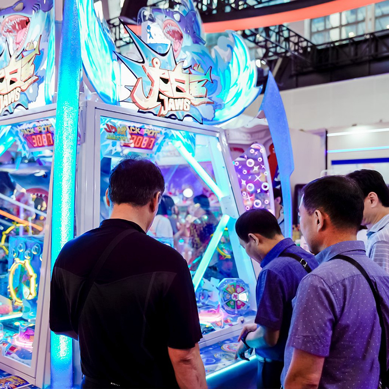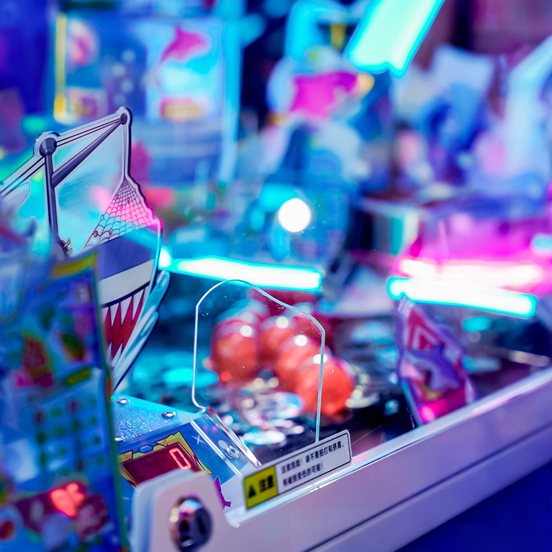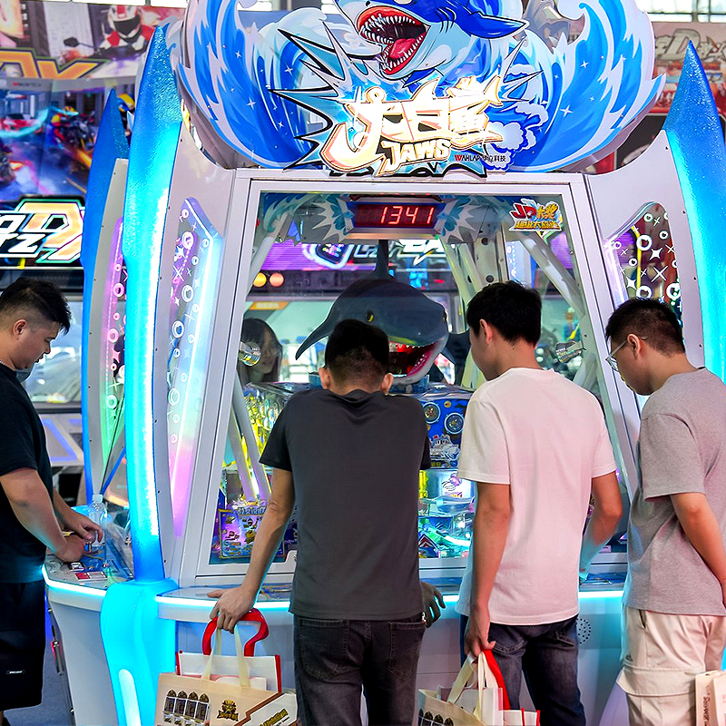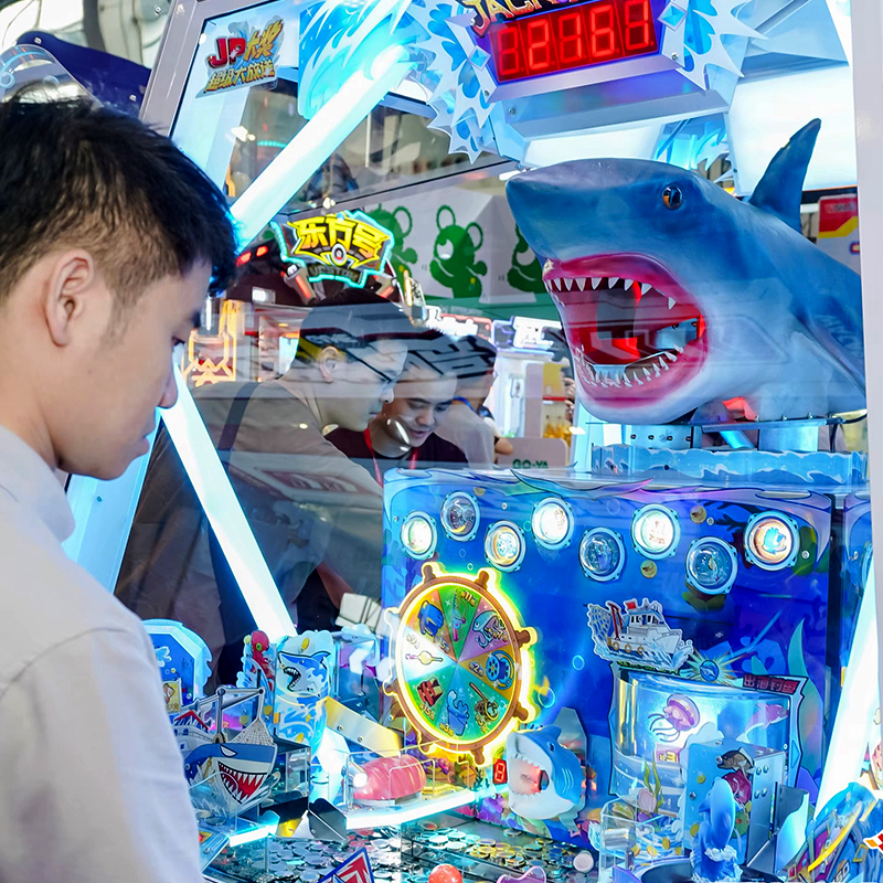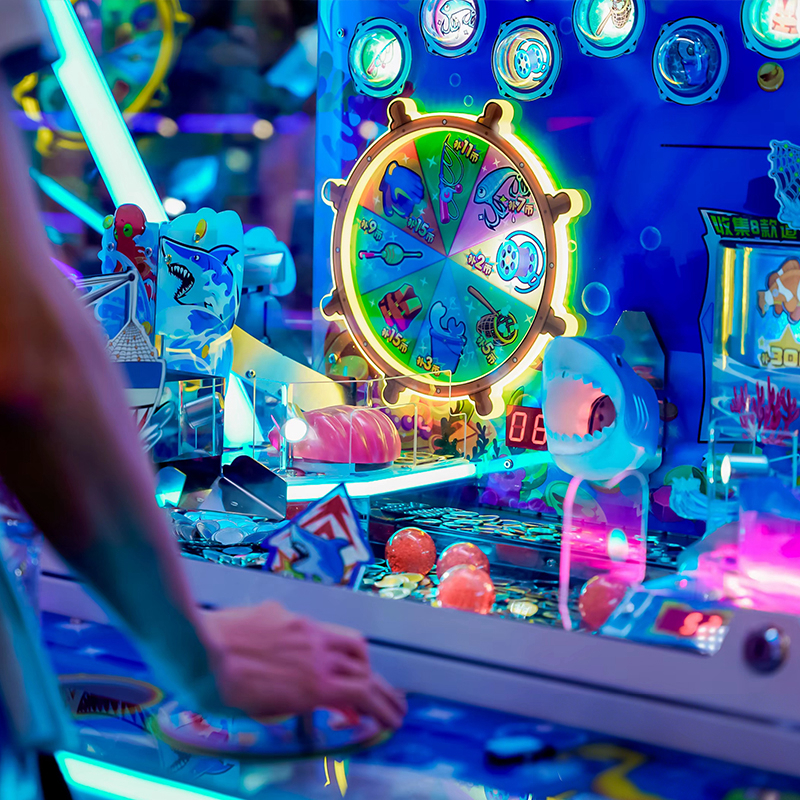 The visual payoff is engineered for excitement. Winning creatures triggers mechanical actions, culminating in the "Great Shark Prize" where the shark rotates and sprays a fountain of tokens. This spectacle defines it as the best arcade redemption attraction among modern arcade coin pusher machines.