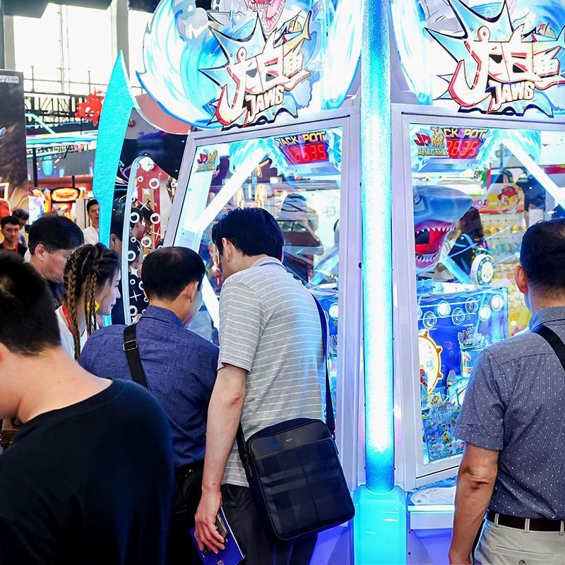 Revolutionizing the standard push penny machine, Jaws features a unique manual hand-crank. Players vigorously crank to launch tokens into the "Small Shark's Mouth" to navigate their boat. This skill-based interaction makes it a highly immersive arcade game machine that stands out in any amusement arcade.